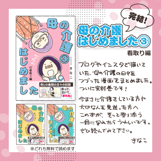 【うちの母いかがですか?】結婚30年目の真実 絵日記 2025.05.08 母の介護はじめました③: 看取り編きなこ0円(12/13 02:07時点)発売日: 2025/04/29Amazon 母の介護はじめました②: 在宅介護編きなこ0円(12/13 02:07時点)発売日: 2025/02/02Amazon 母の介護はじめました➀: 入院編きなこ0円(12/13 19:44時点)発売日: 2024/11/16Amazon