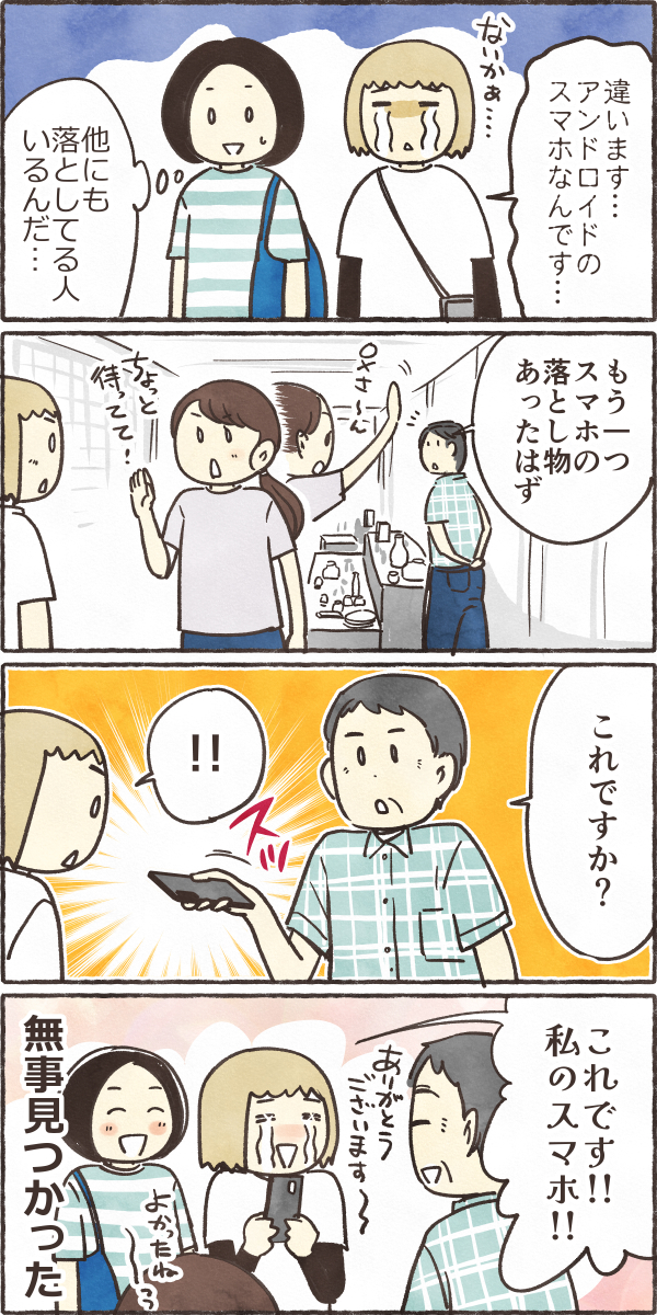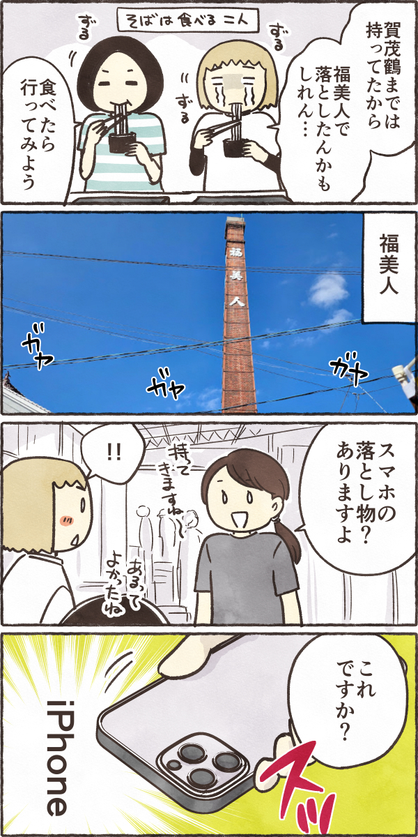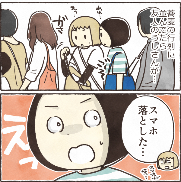 友人のうしさんが酒まつりでスマホを落とした話 絵日記 2025.10.13 酒まつりで蕎麦の行列に並んでいたら、 友人のうしさんがなにか探しているのです… 一大事だけど、蕎麦はちゃんと食べます(笑) 喜んだのもつかの間… 親切な人に拾われて本当にありがたかった…人の優しさが沁みました🙏