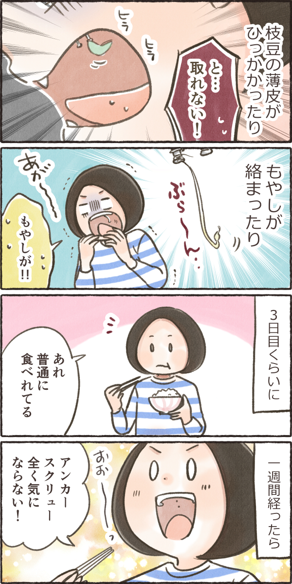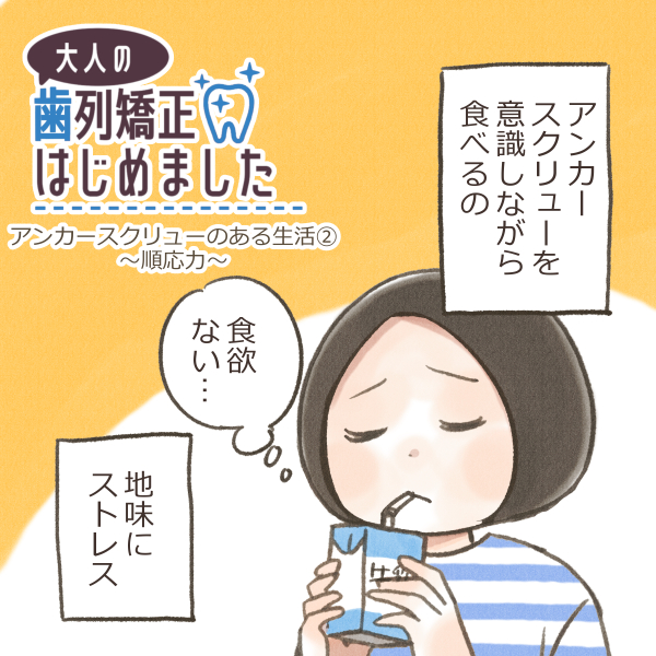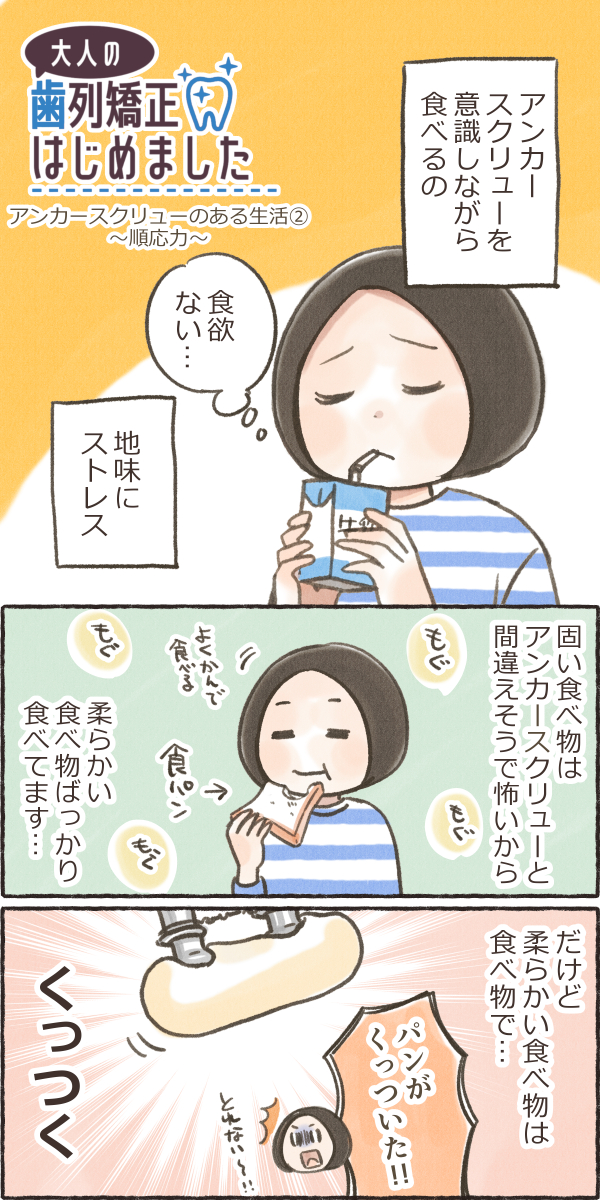 大人の歯列矯正はじめました「アンカースクリューのある生活②」 歯列矯正 2026.02.28 上顎についたアンカースクリュー、最初はかなり気になっていましたが、一週間くらいで慣れました。 今つらい方も、少しずつ順応していくと思います…!