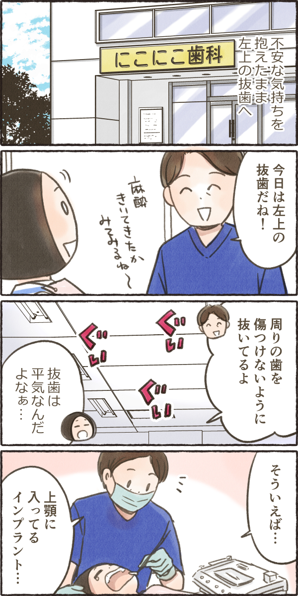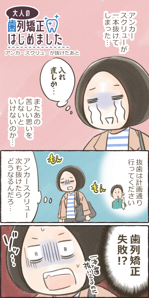 大人の歯列矯正はじめました「アンカースクリューが抜けた後」 歯列矯正 2026.03.21 アンカースクリューが抜けてしまい、 ちょっと不安なまま次の抜歯へ。 抜歯は無事に終わったのですが、 先生にふと聞かれた一言で… え?なにかあった!?😨